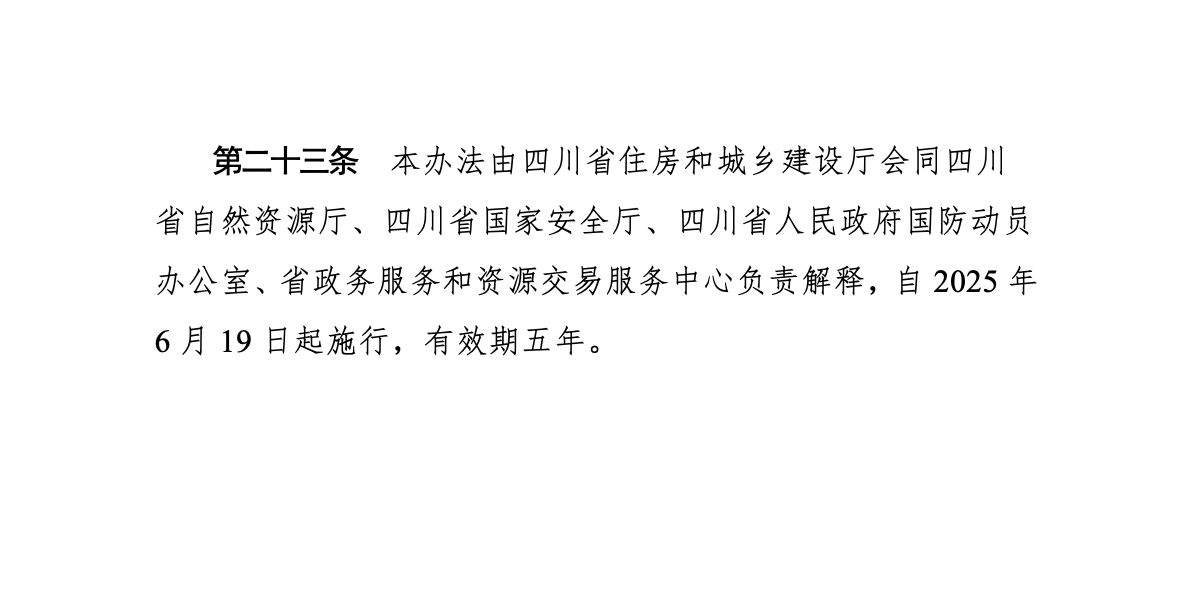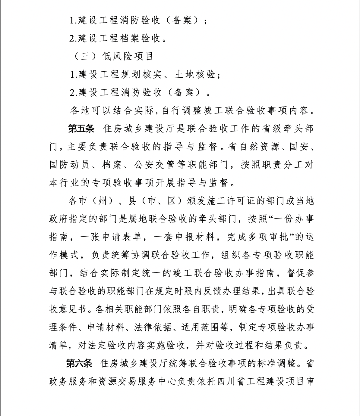 四川省住房和城乡建设厅、四川省自然资源厅、四川省国家安全厅、四川省人民政府国防动员办公室和省政务服务和公共资源交易服务中心联合印发了《四川省房屋建筑和市政基础设施工程竣工联合验收管理办法》。