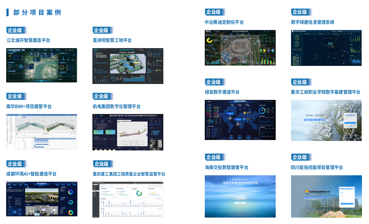 目前已为1000+重点项目提供数字建设服务,包括重庆江北机场T3航站楼、南宁吴圩国际机场、十堰武当山机场、轨道18/15/6号线、郭家沱/南纪门/红岩村大桥、来福士、光环购物中心、雄安水厂、深圳罗铁输水隧洞工程、锦屏大设施等国家级/省部级重点项目,以及海外塔吉克斯坦塞布佐水电站、沙特吉达市中心项目。服务客户包含重庆市建委、重庆建工、中冶、中建、中铁、中铁建、中电建、万科等企业,其中政府监管部门、大型城建公司、央国企业务占比达到80%。