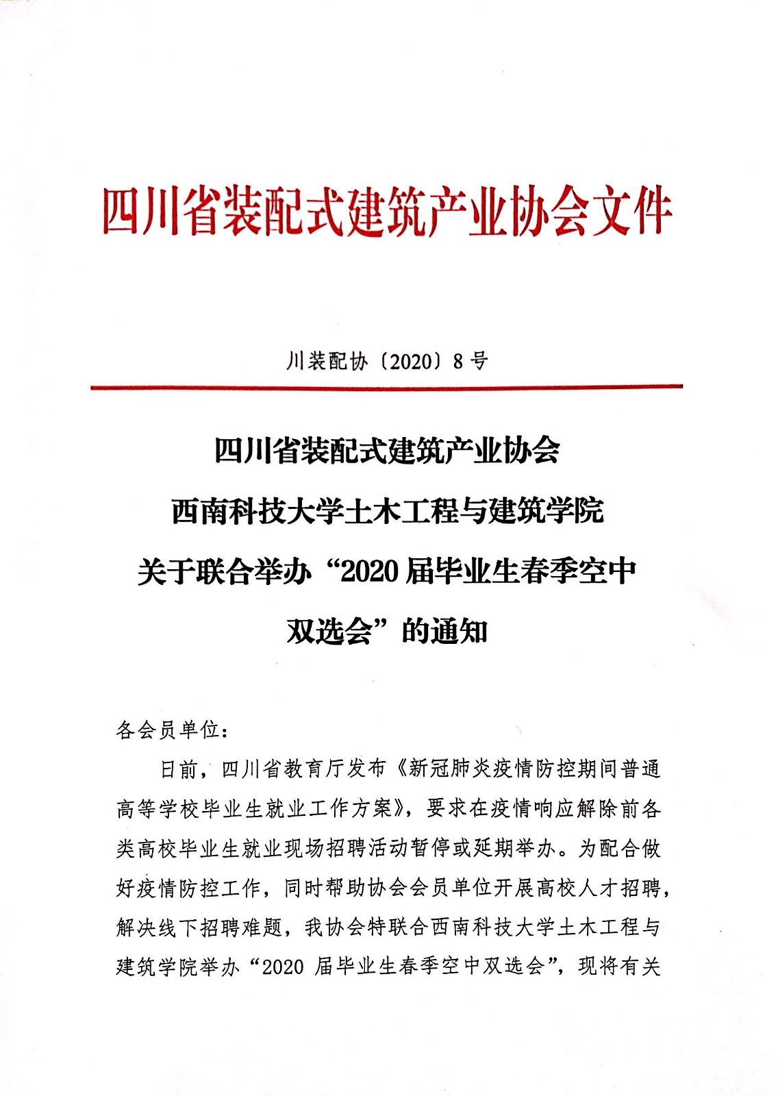 四川省装配式建筑产业协会、西南科技大学土木工程与建筑学院关于联合举办“2020届毕业生春季空中 双选会”的通知.pdf