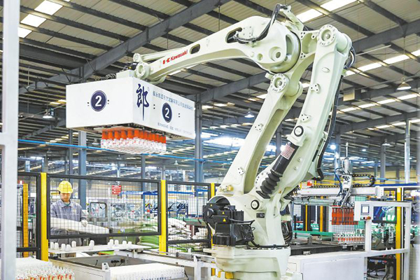 一月八日,泸州市叙永郎酒东方玻璃有限公司生产线上,工人和智能机器人在赶制订单,冲刺年初“开门红”。