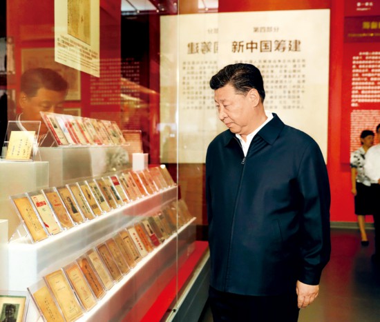 2019年9月12日,中共中央总书记、国家主席、中央军委主席习近平视察中共中央北京香山革命纪念地。这是习近平在香山革命纪念馆参观《为新中国奠基》主题展览。