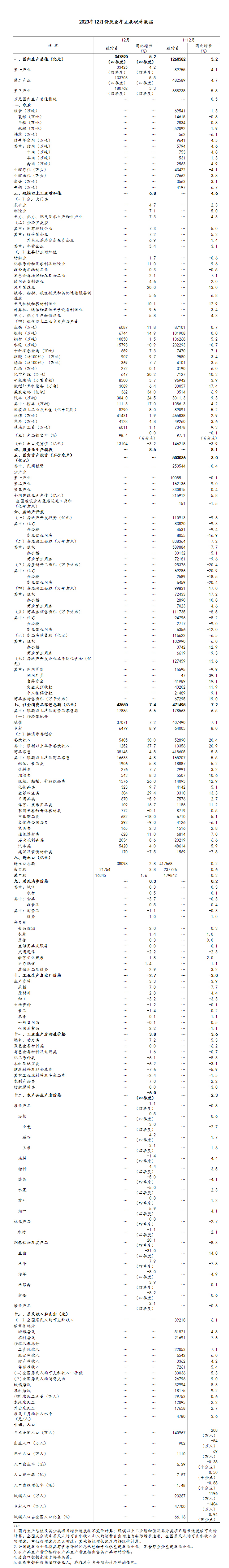 (2)根据季节调整模型自动修正结果,对近一年来各期国内生产总值、规模以上工业增加值、固定资产投资(不含农户)、社会消费品零售总额环比增速进行修订。修订结果及2023年四季度GDP环比数据、2023年12月份其他指标环比数据如下: