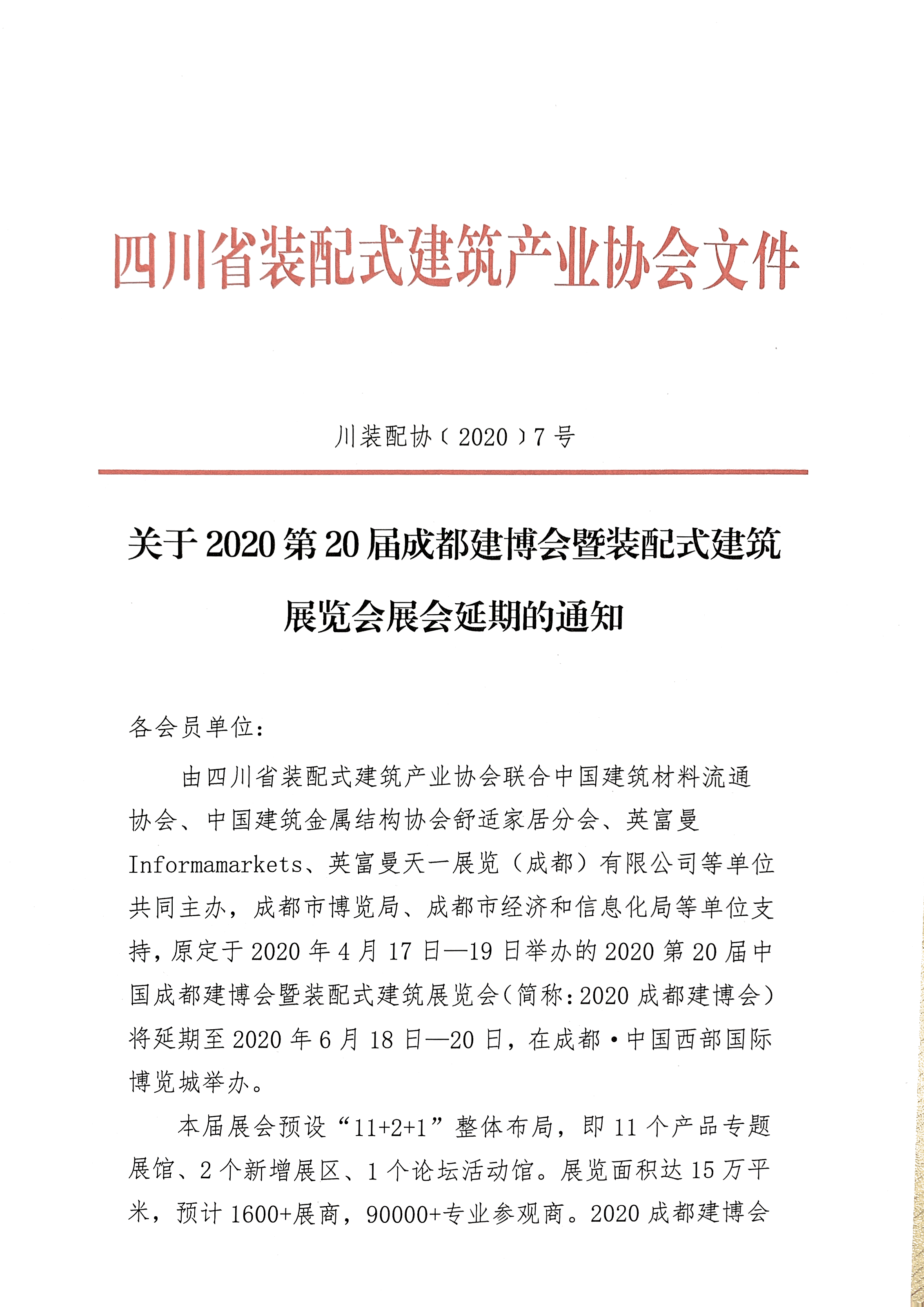 通知 | 关于2020第20届成都建博会暨装配式建筑展览会展会延期的通知