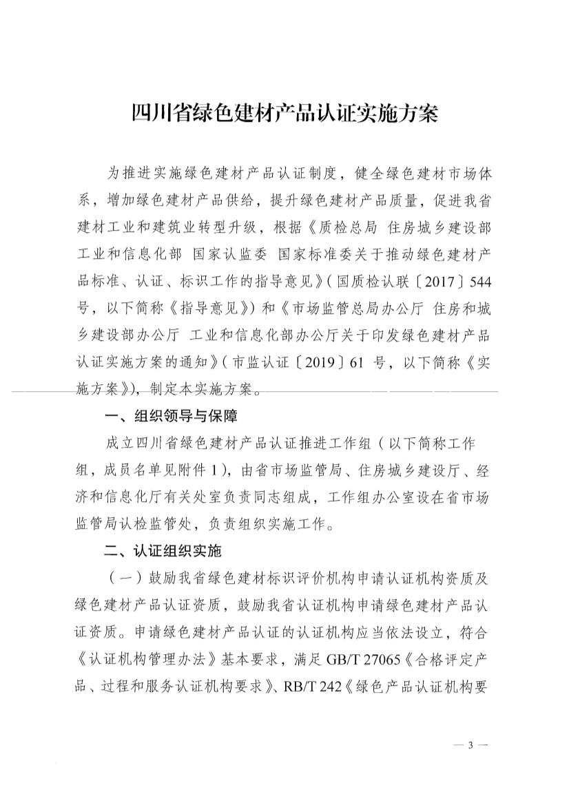 为贯彻落实《市场监管总局办公厅 住房和城乡建设部办公厅 工业和信息化部办公厅关于印发绿色建材产品认证实施方案的通知》(市监认证[2019]61号)要求,省市场监管局、住房城乡建设厅、经济和信息化厅联合制定了《四川省绿色建材产品认证实施方案》。现印发你们,请结合本地区实际认真组织实施。