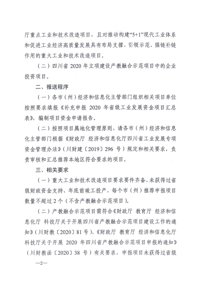 转发 | 四川省经济和信息化厅关于补充征集2020年省级工业发展资金重点项目的通知