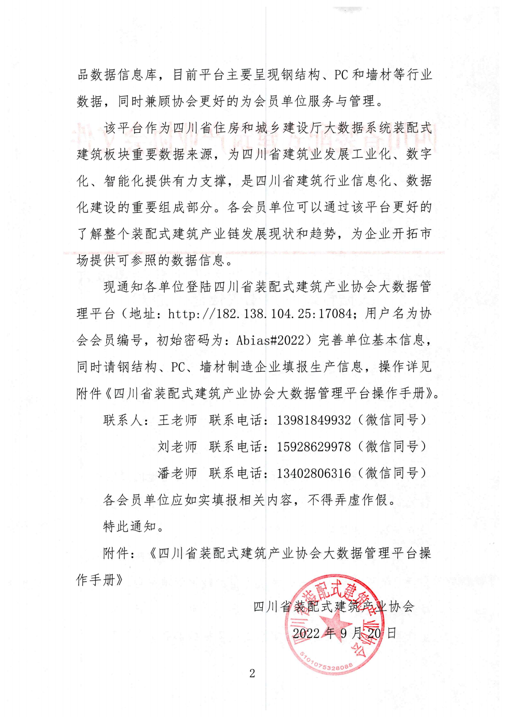 现通知各单位登陆四川省装配式建筑产业协会大数据管理平台(地址:http://182.138.104.25:17084;用户名为协会会员编号,初始密码为:Abias#2022)完善单位基本信息,同时请钢结构、PC、墙材制造企业填报生产信息,操作详见附件《四川省装配式建筑产业协会大数据管理平台操作手册》。