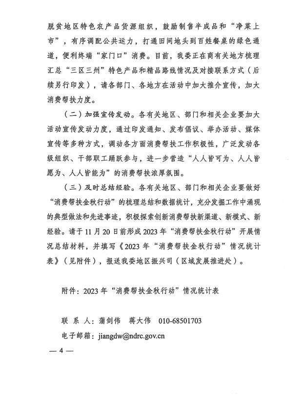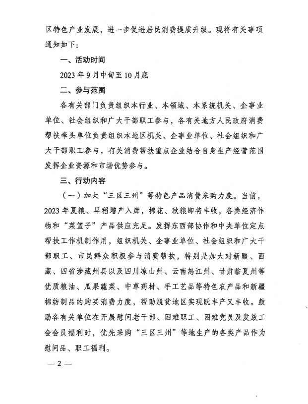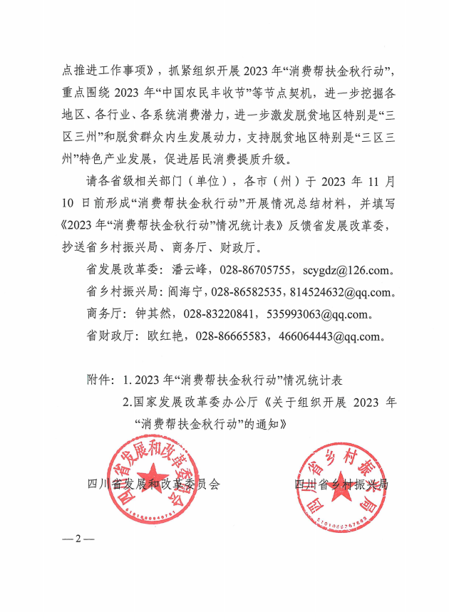 为贯彻落实习近平总书记关于继续大力实施消费帮扶的重要指示精神和党中央、国务院决策部署,四川省发展和改革委员会、四川省乡村振兴局、四川省商务厅、四川省财政厅联合组织开展2023 年“消费帮扶金秋行动”,以下为通知原文: