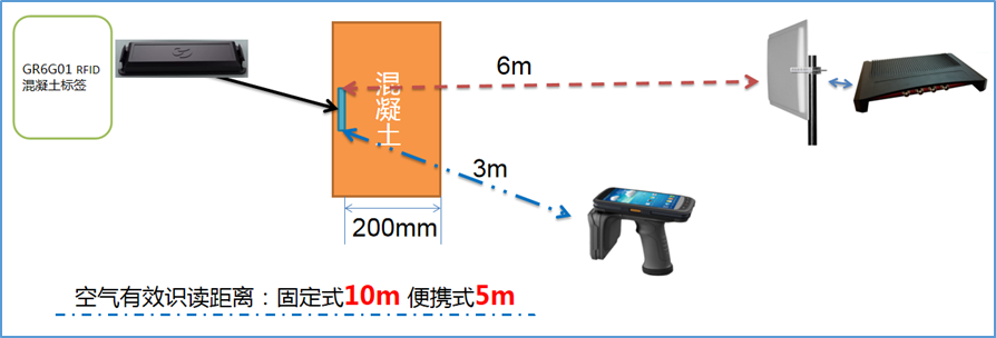 3、当标签预埋深度为200mm时,仍能与管理设备实现正常识别与数据传输,使用便携式移动读写器读取距离达到3米,使用固定式读写器读取距离达到6米;