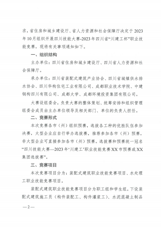 四川省住房和城乡建设厅 四川省人力资源和社会保障厅关于举办“四川技能大赛-2023年四川省‘川建工杯’职业技能竞赛”的通知